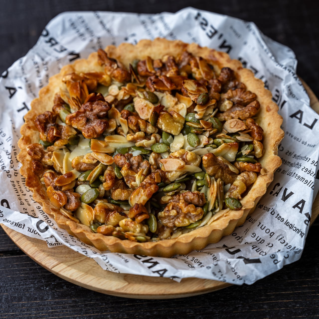 ナッツがぎっしりと詰まったキャラメルナッツタルトは、しっかりとしたタルト生地にくるみ、アーモンド、かぼちゃの種を程よい甘さでひとつにまとめたフィリングはタルトとの相性抜群!です。